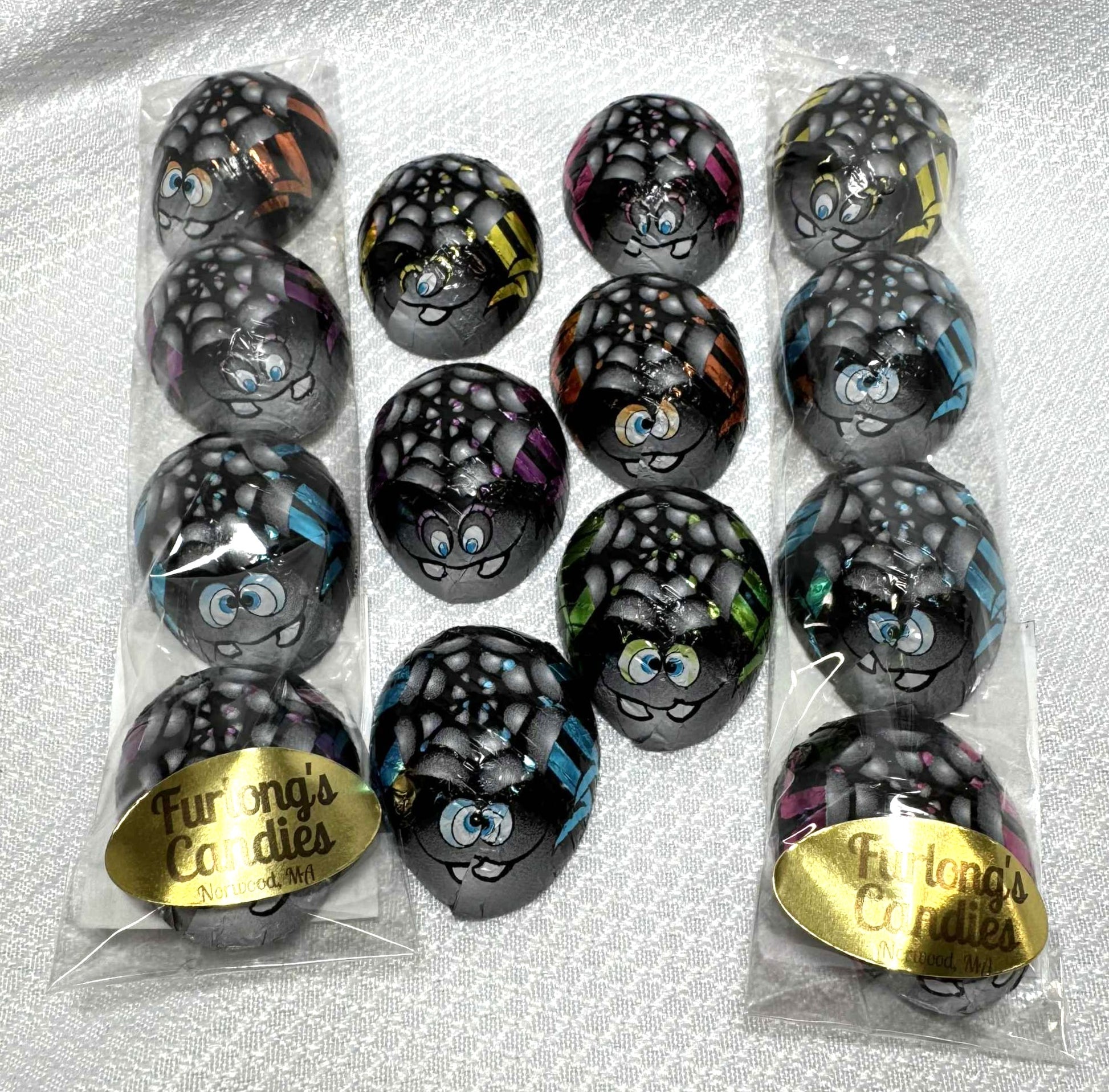 1/2 oz creamy milk chocolate spiders wrapped in foil. Available by the piece or in a 4-pack.