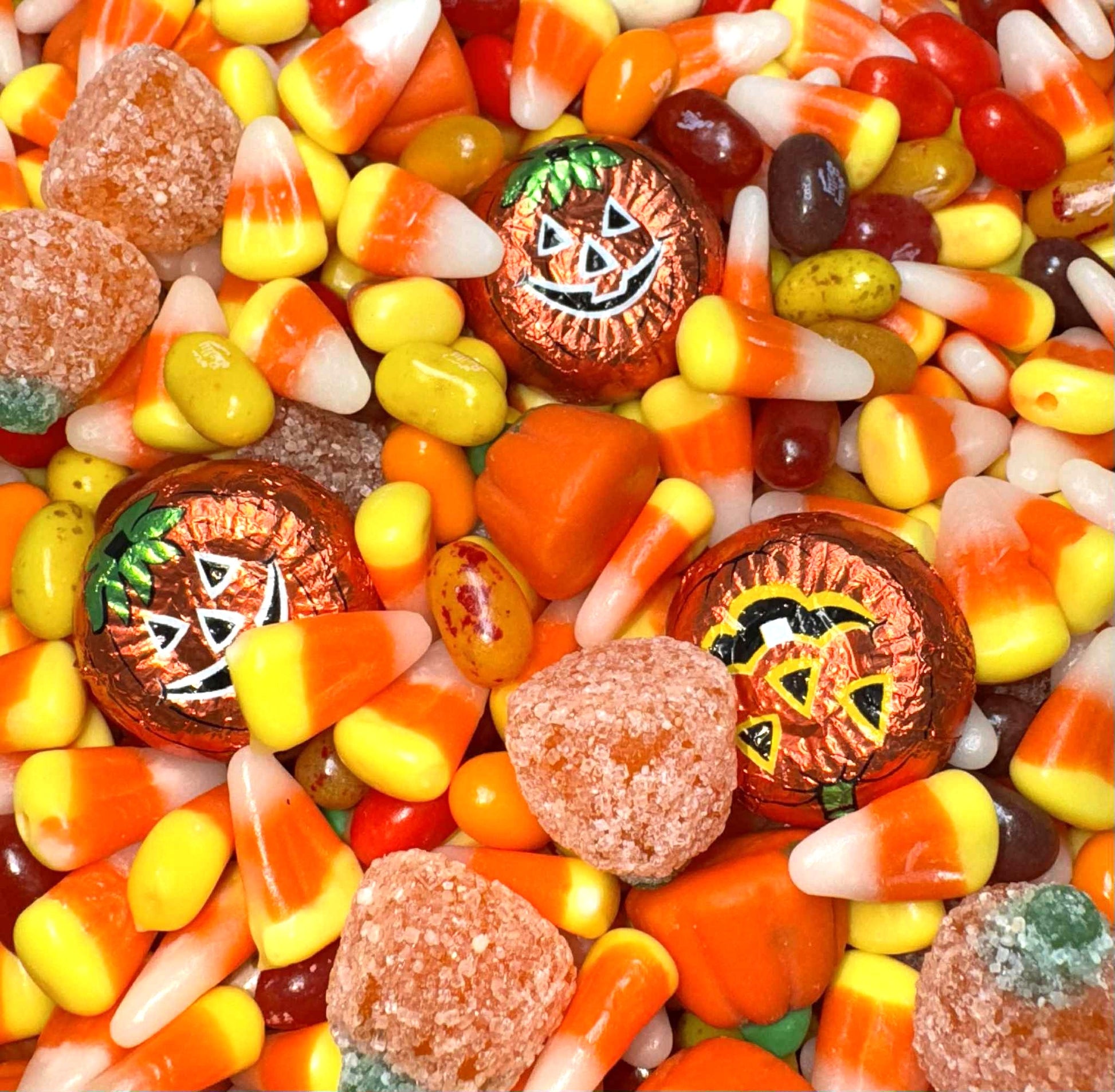 Variety of Halloween favorites - Candy Corn, Mellow Creme Pumpkins, Sour Gummi Pumpkins, Autumn Mix Jelly Beans and Milk Chocolate Foils